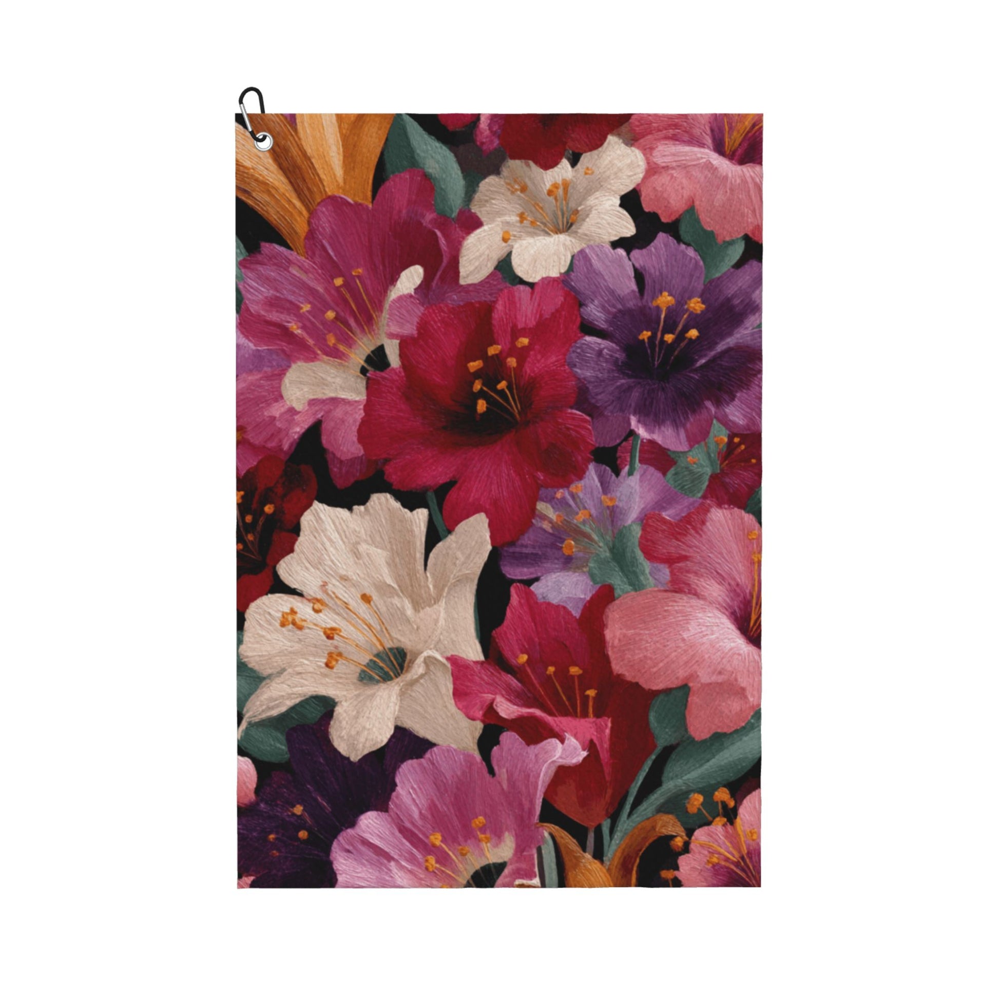 Bring vibrant energy to your game with this colorful floral golf towel, adorned with a dazzling mix of red, pink, purple, and orange blossoms. The striking flower print design offers a bold aesthetic that adds a stylish flair whether you're on the course, in the gym, or out on a hike.