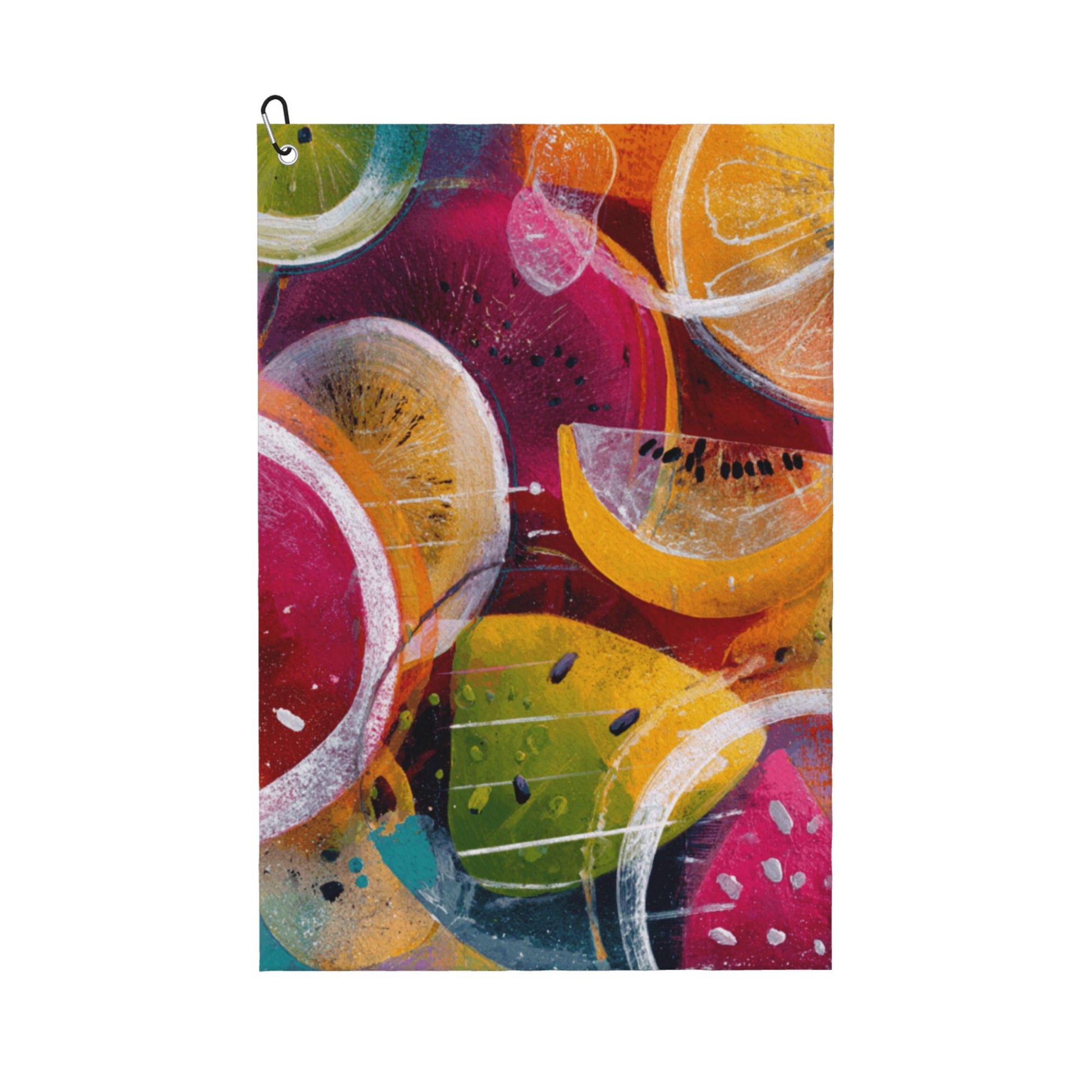 Bring a burst of summer freshness to your game with this colorful fruit slice golf towel. Featuring abstract renditions of kiwi, orange, lemon, watermelon, and more, the towel’s vibrant design exudes energy and fun—perfect for sunny days on the course or at the gym.